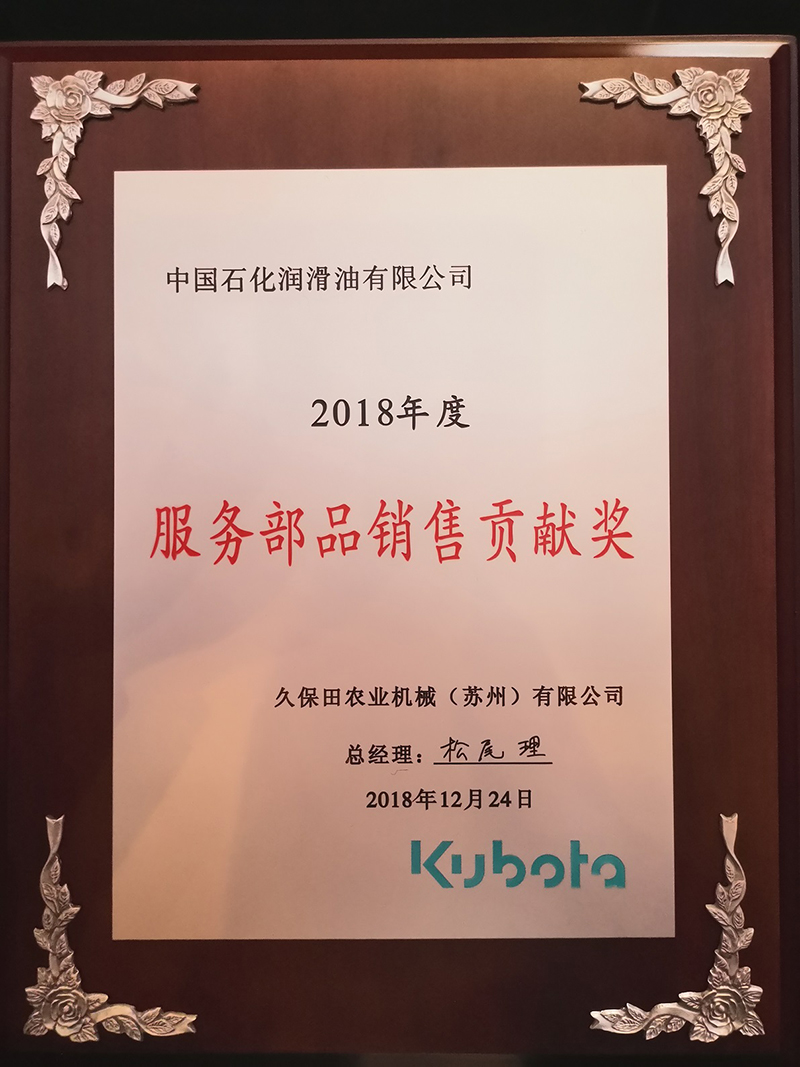 2018年長城潤滑油獲得久保田服務部品獎