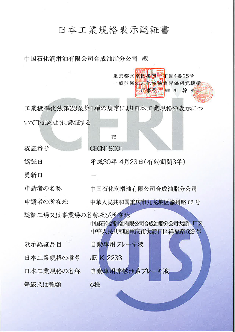 【制動液】中國石化潤滑油有限公司合成制動液CLASS6獲得JIS K2233認證證書-1