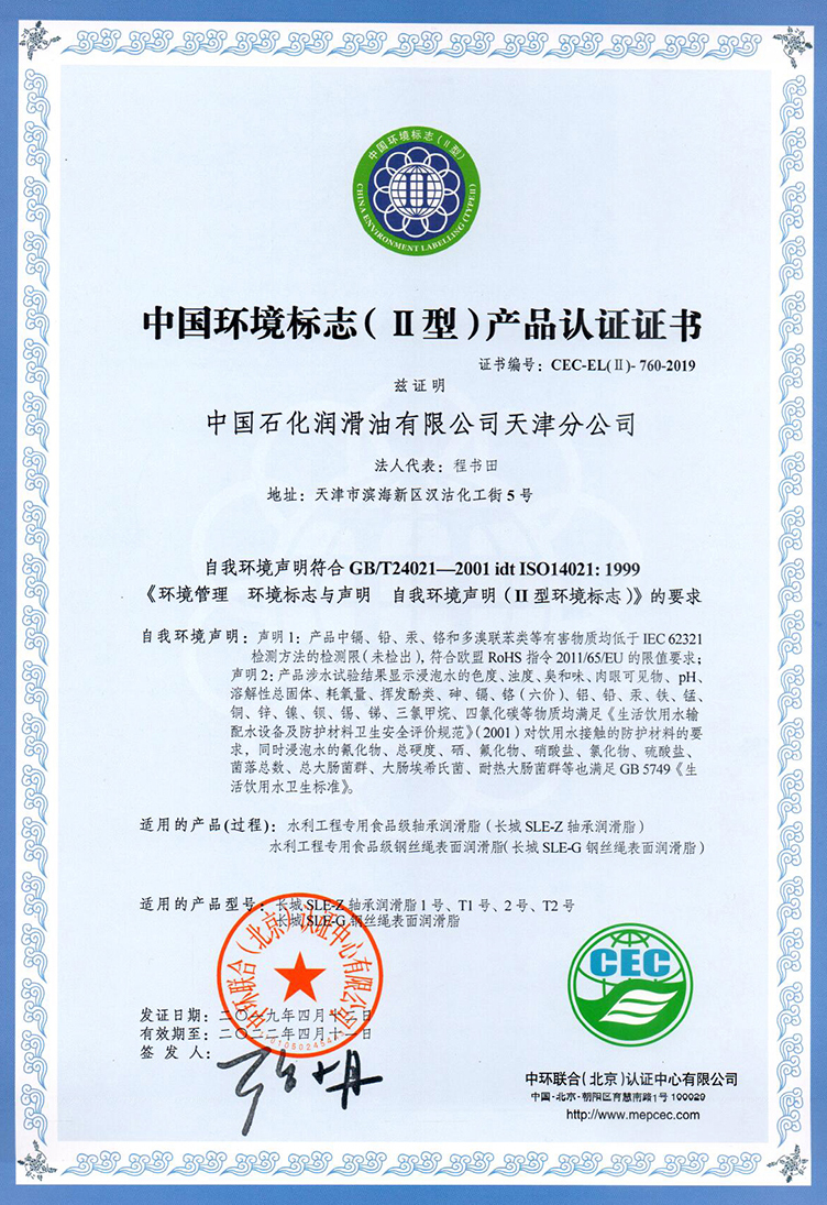 【潤滑脂】中國石化潤滑油天津分公司的水利工程專用食品級軸承潤滑脂、水利工程專用食品級鋼絲繩表面潤滑脂兩款產品,通過了中國環境標志(Ⅱ型)產品認證