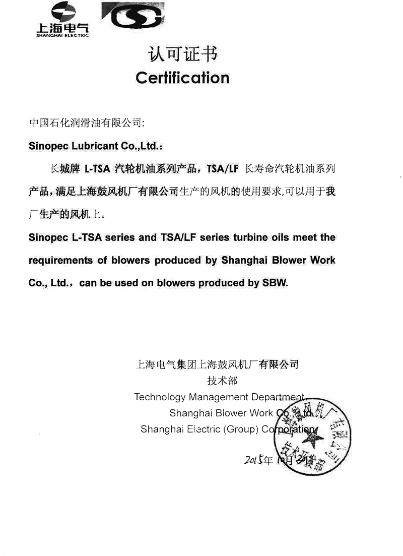 長城汽輪機油獲得上海電氣認證