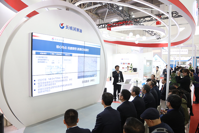 (圖:中國石化長城潤滑油風電潤滑產品展示,現場觀眾正在展臺咨詢)