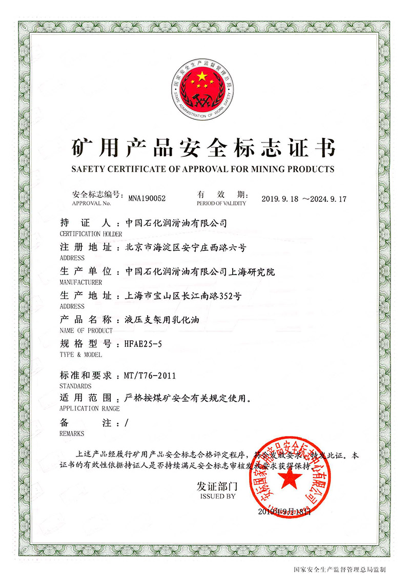長(zhǎng)城HFAE25-5液壓支架用乳化油的安全標(biāo)志編號(hào)為MNA190052,證書有效期至2024年9月。
