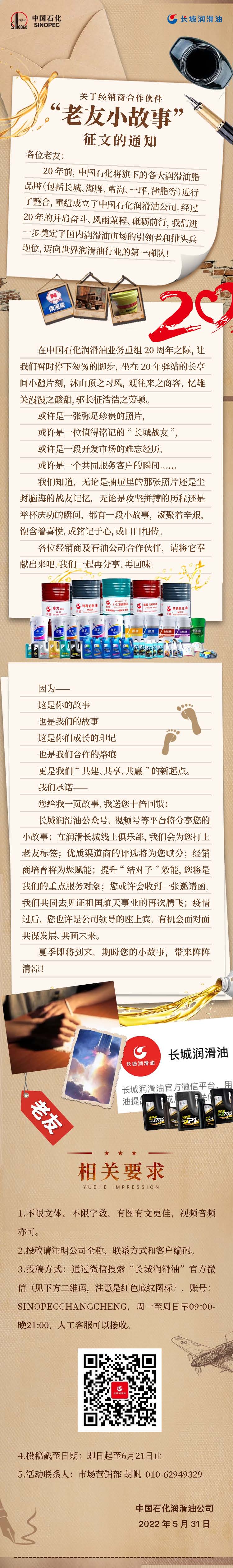 ? ? ? ?2022年5月29日是中國(guó)石化潤(rùn)滑油專業(yè)公司成立二十周年,由此,中國(guó)石化潤(rùn)滑油有限公司面向廣大經(jīng)銷商合作伙伴們發(fā)起了“老友小故事”征文活動(dòng)。