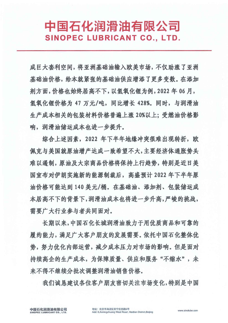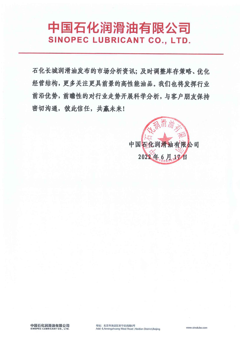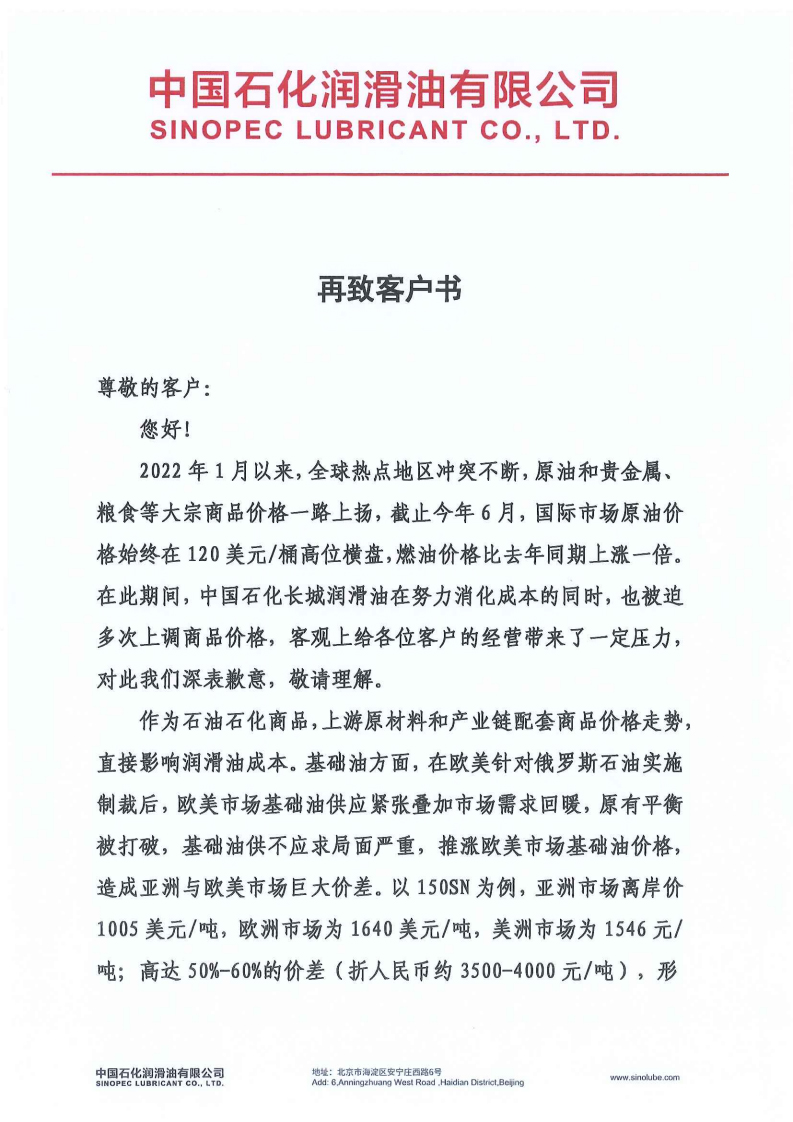 中國石化潤滑油有限公司《再致客戶書》