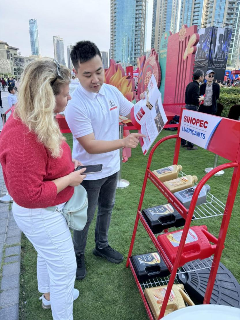 中國石化潤滑油中東非洲代表處派遣員工,提供若干油品、貨架、產(chǎn)品折頁等宣傳物料參與巡游活動(dòng),并向感興趣的客人介紹SINOPEC潤滑油產(chǎn)品。