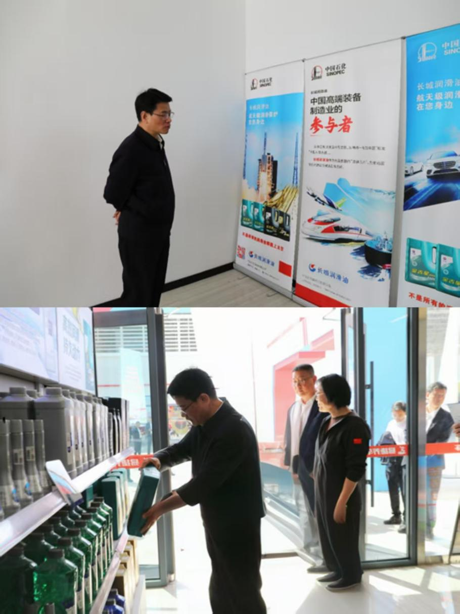 【中國石化股份公司副總裁、銷售公司董事長、黨委書記李玉杏蒞臨潤滑油展區,饒有興致地拿起J600加油站專供產品并詳細了解產品特點】