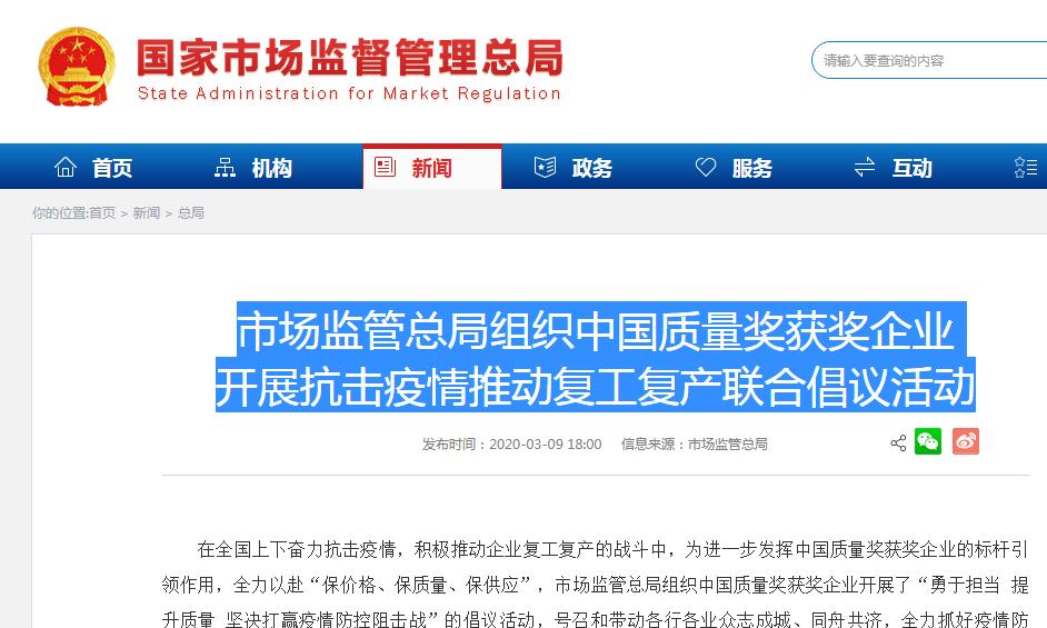 當前全國上下奮力抗擊疫情,積極推動企業復工復產。為進一步發揮中國質量獎獲獎企業的標桿引領作用,全力以赴“保價格、保質量、保供應”,3月9日,市場監管總局組織中國質量獎獲獎企業開展了“勇于擔當 提升質量 堅決打贏疫情防控阻擊戰”的倡議活動。中國石化潤滑油有限公司作為第二屆中國質量獎提名獎獲得者,也是唯一石油化工行業獲獎企業,積極響應號召并參加活動。