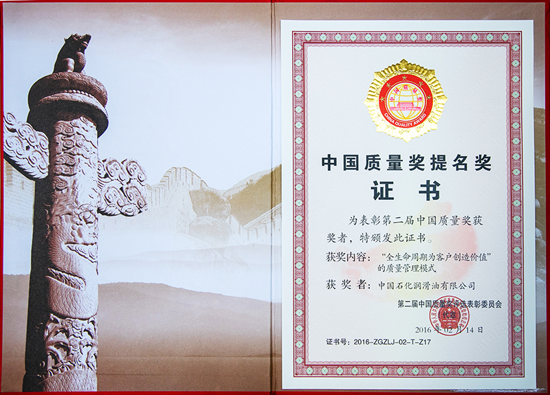 2016年,中國石化潤滑油有限公司獲得第二屆中國質量獎提名獎。