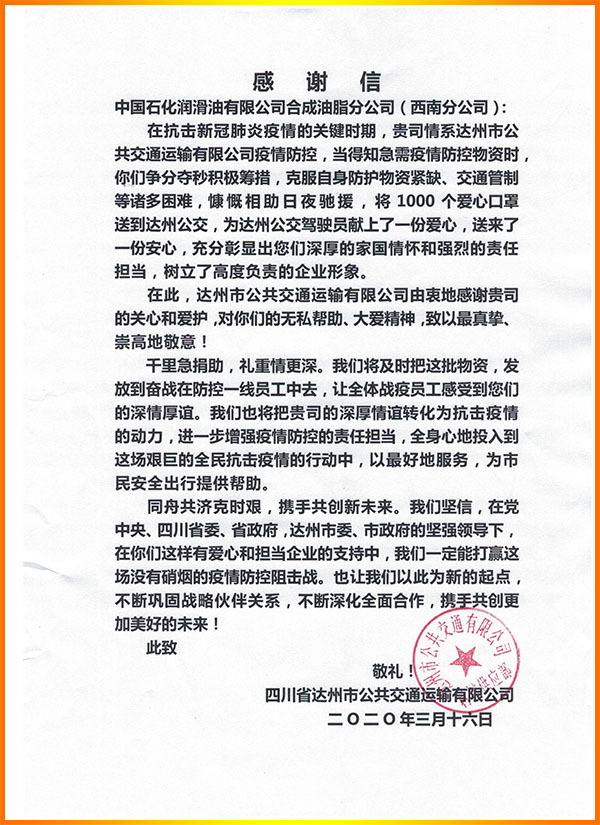 3月19日,四川達(dá)州市公交有限公司將一封熱情洋溢的感謝信,傳遞到中國(guó)石化潤(rùn)滑油合成油脂分公司,以此感謝中國(guó)石化長(zhǎng)城潤(rùn)滑油情系合作伙伴,在自身口罩等防疫物資緊張的情況下,仍慷慨解囊,星夜馳援,支持達(dá)州公交戰(zhàn)疫,讓一線駕乘人員在工作中增加了一份防護(hù)與溫暖。
