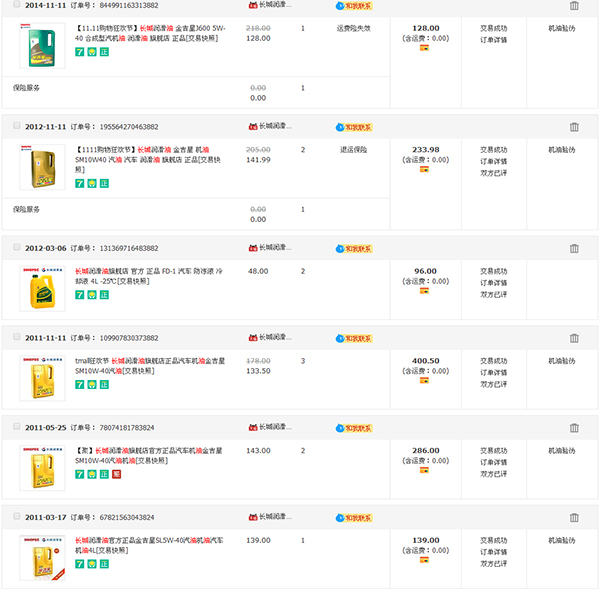 從一開始的從油站、維修廠購油,到了后來,2011年,發現淘寶上有長城的旗艦店,就一直在旗艦店購買,成了長城的忠實粉。算起來,現在是第六個年頭了。期望長城能繼續給力,堅持良好的油品,不要讓忠粉們失望哦。哈哈,不是老作,這個有圖為證,下面截圖的附上。
